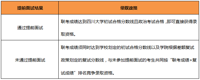 復(fù)試包括常規(guī)面試和政治考試,通過提前面試的考生參加政治考試合格則直接獲得錄取資格;未通過提前面試及未參加提前面試的考生參加政治考試合格后按照“聯(lián)考成績+面試成績”排名競爭錄取資格。